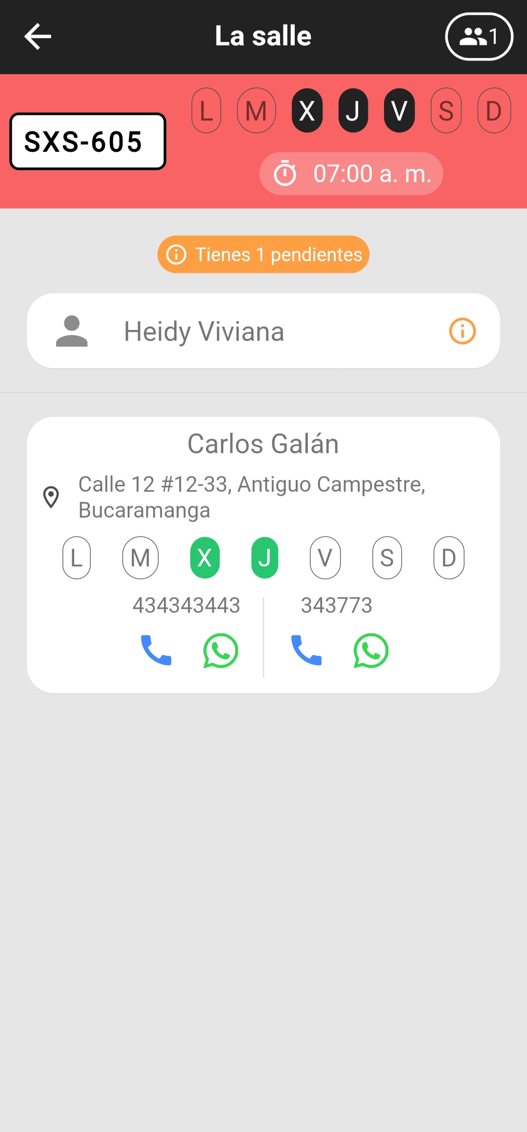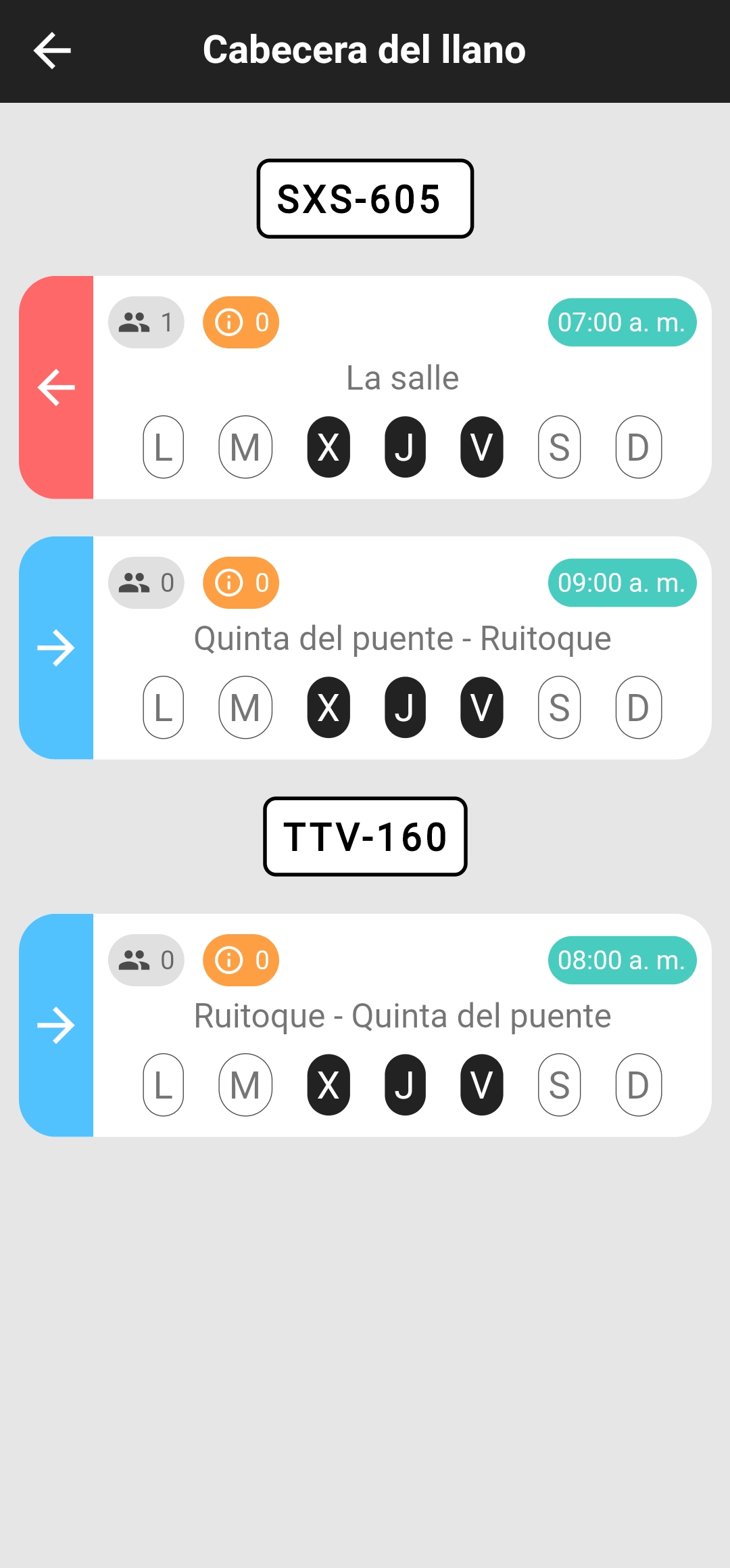 En cada trayecto encontrarás tus itinerarios agrupados por vehiculo, cada itinerario tendrá información sobre: sentido de la ruta, cantidad de pasajeros, cantidad de solicitudes y horarios prestablecidos.